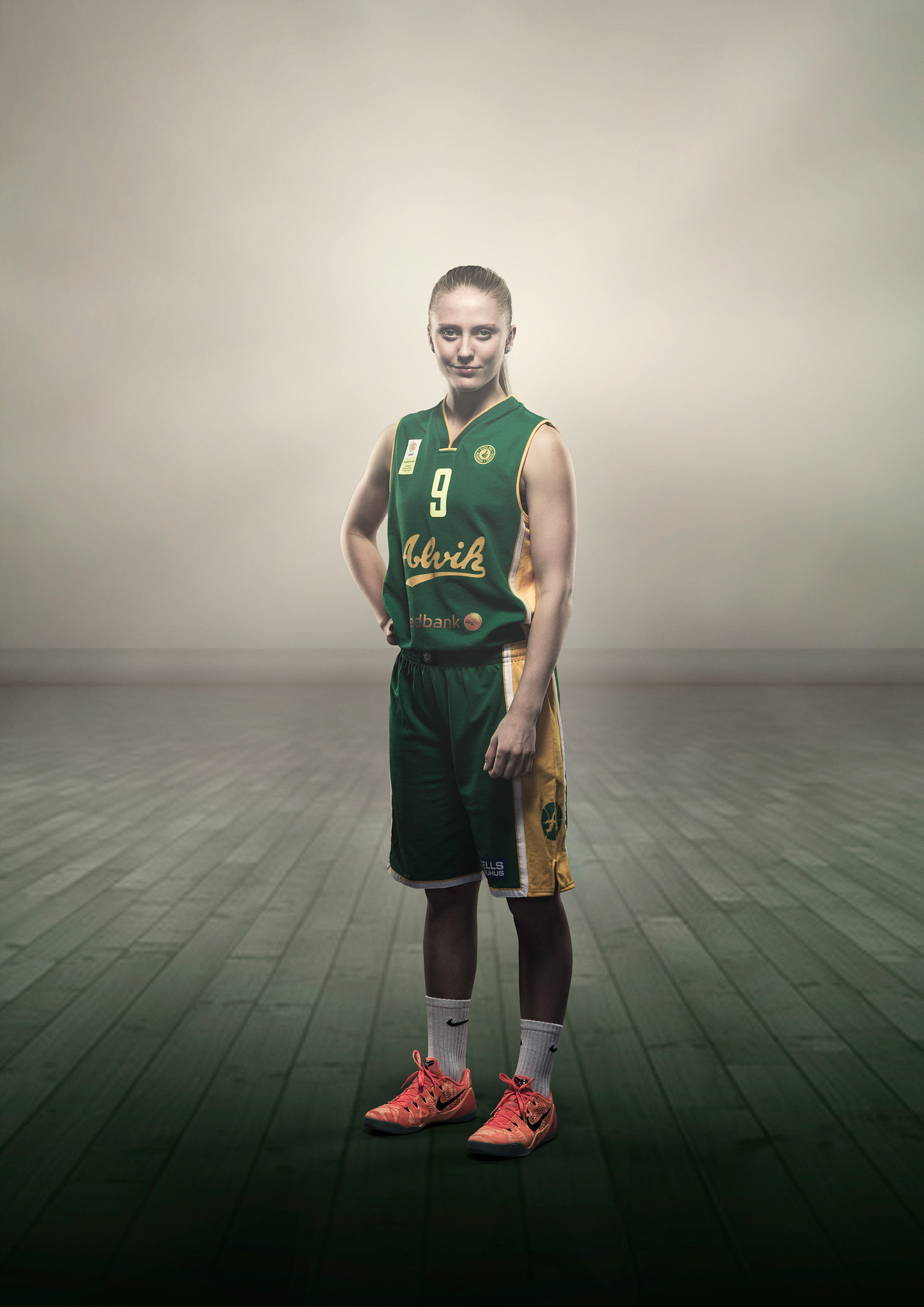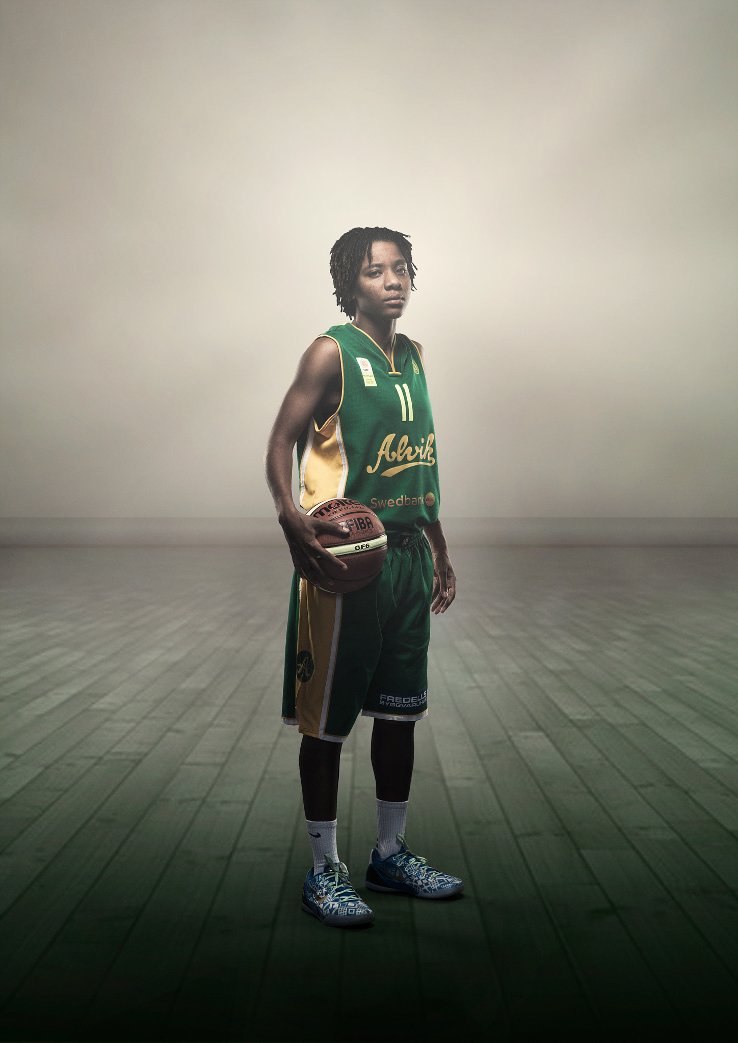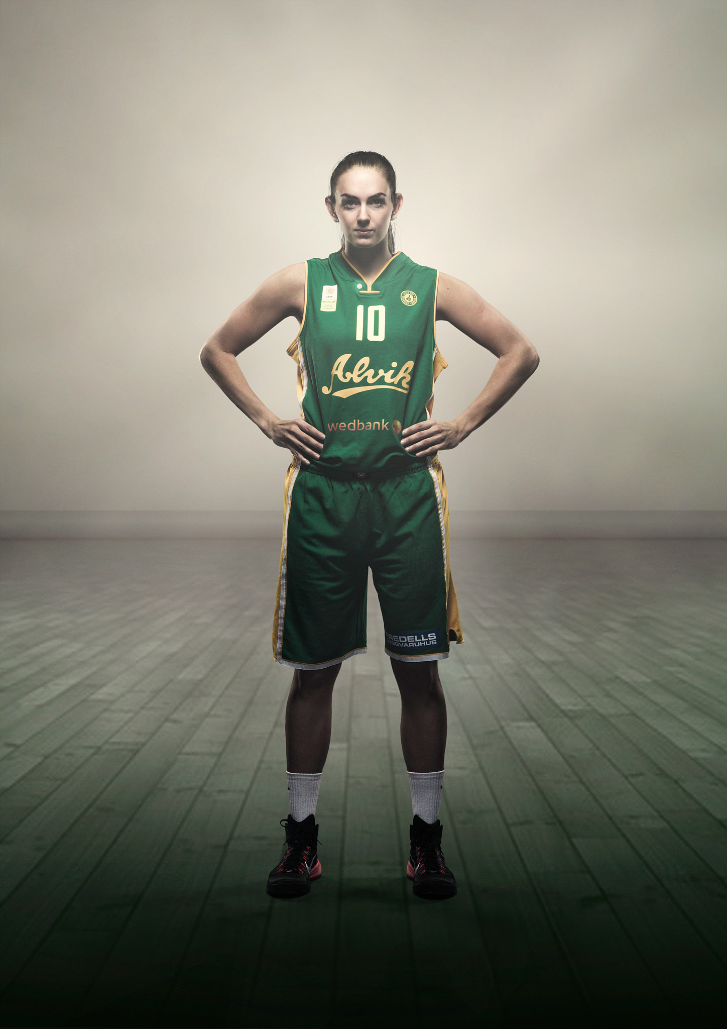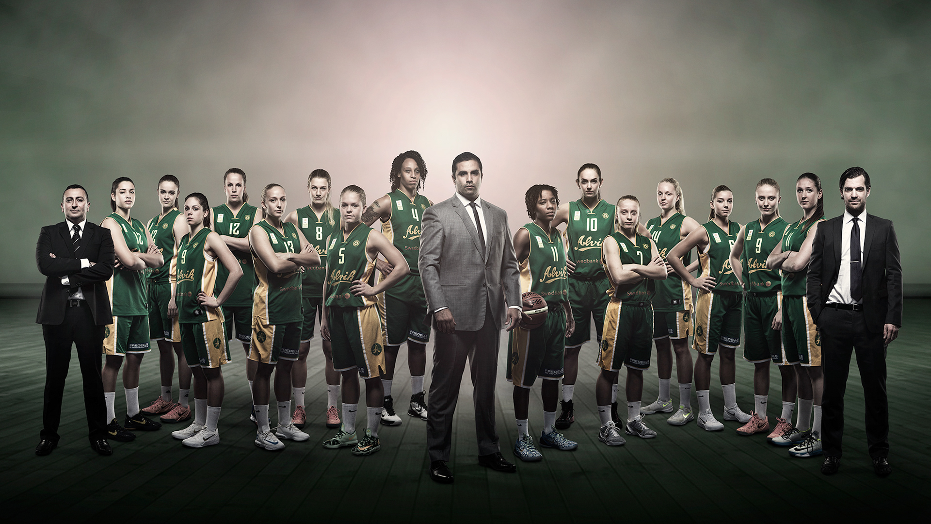 Group image (composite) and individual photos of players and coaches of the Alvik Basket Women's team from the Swedish Basketball League. Photography & retouch: Love Lannér