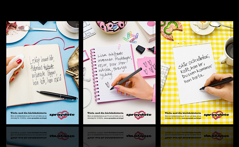 Client: Spraydate Project: Ads for poem contest Advertising Agency: Hummingbirds Art Director: Peder Westerberg Project Manager: Matilda Norén Photography & Retouch: Love Lannér